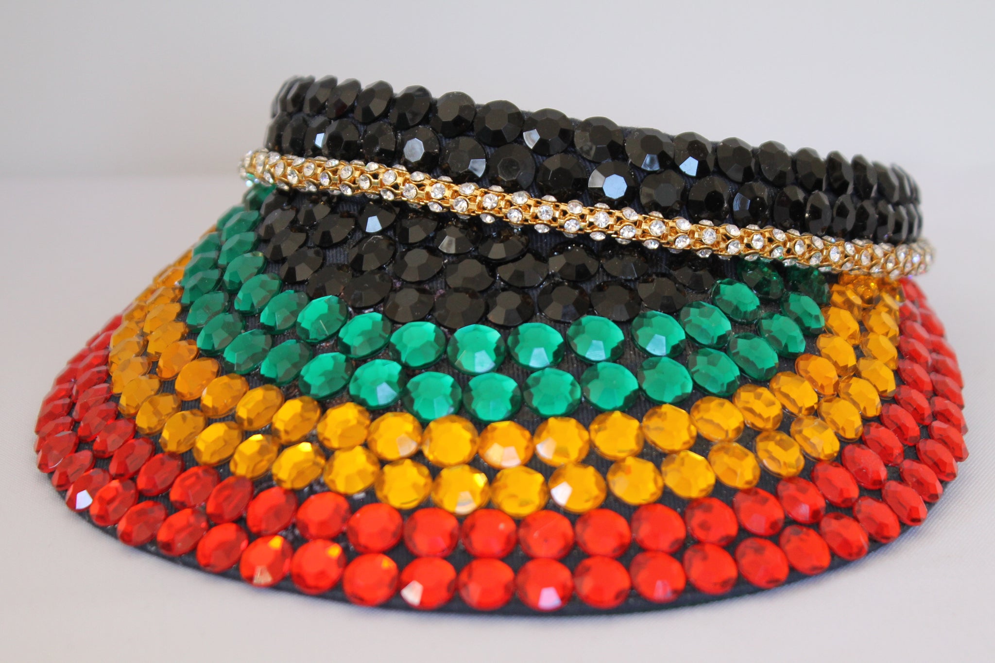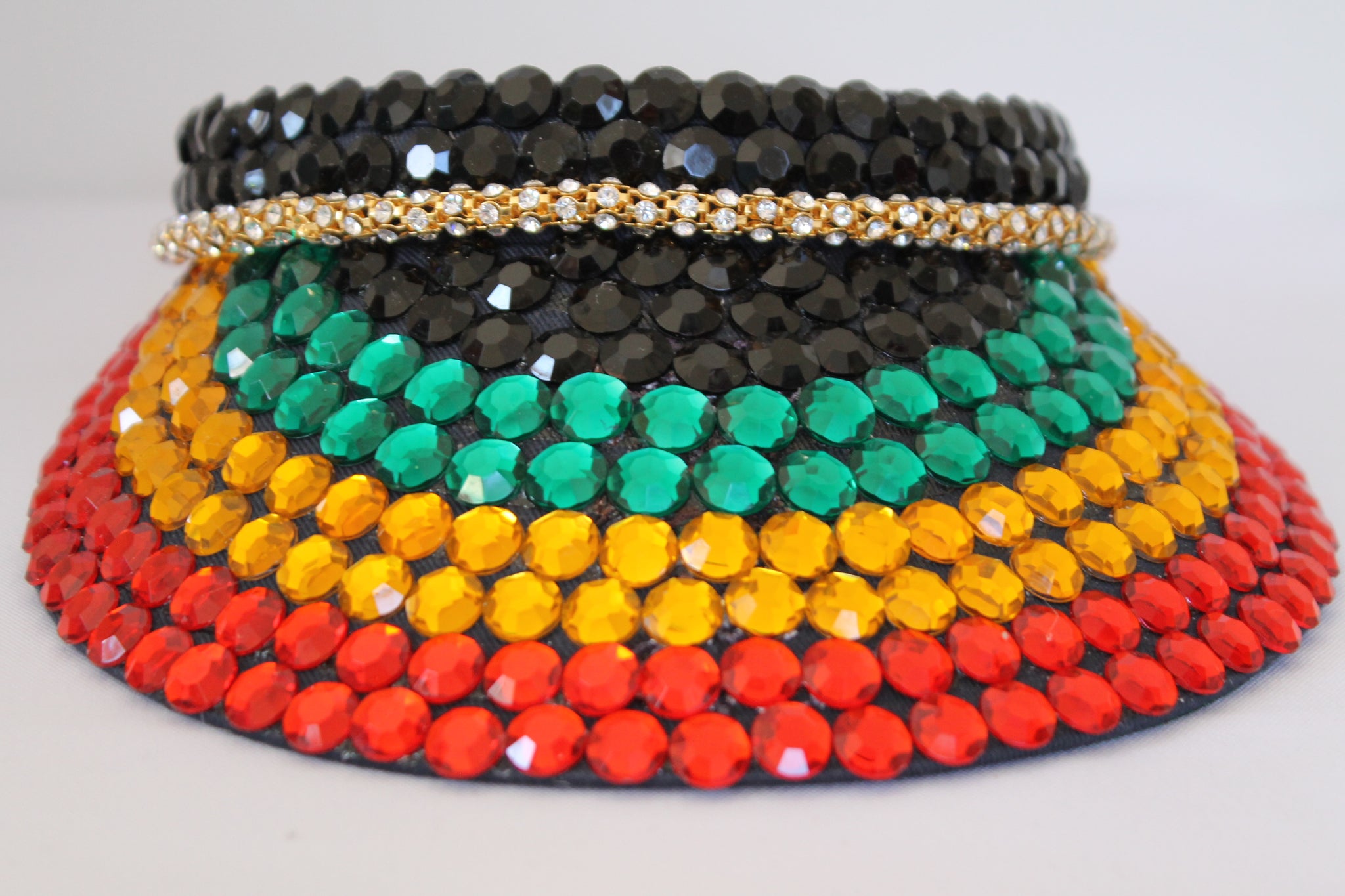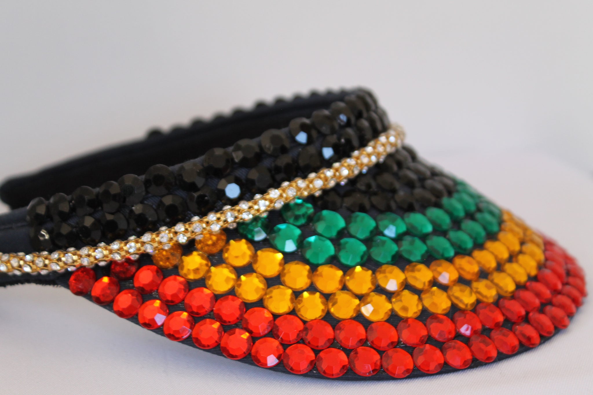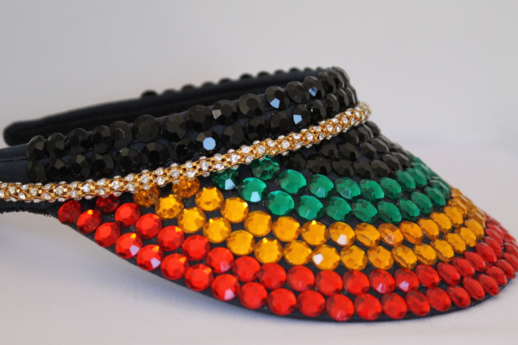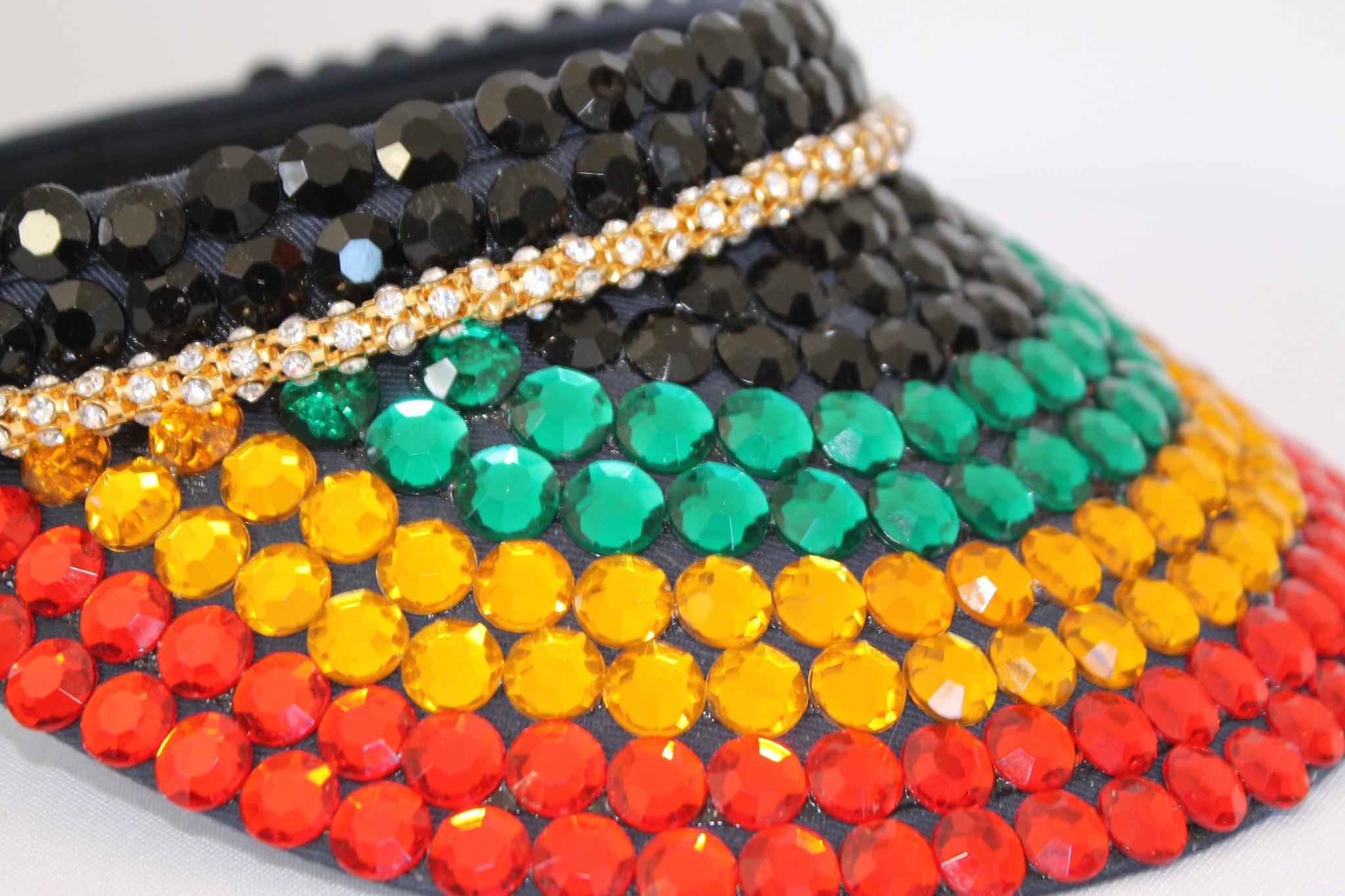 Be the "Princess In Town" with this beautiful visor. With a black base, this visor is covered in high quality red, green, yellow, and black gemstones. On the top, is a gold detail covered in mini clear stones. (With an open back, this visor can adjust to fit any adult sized head.)