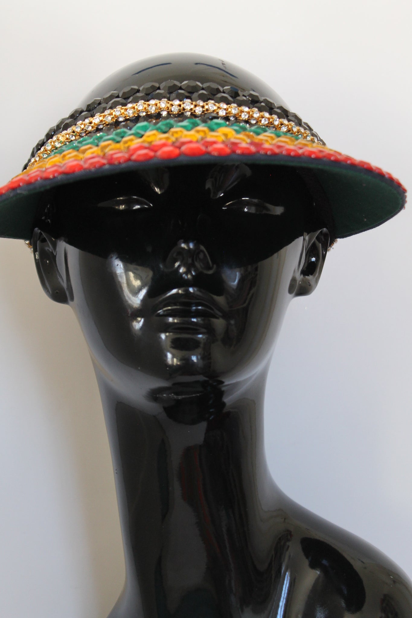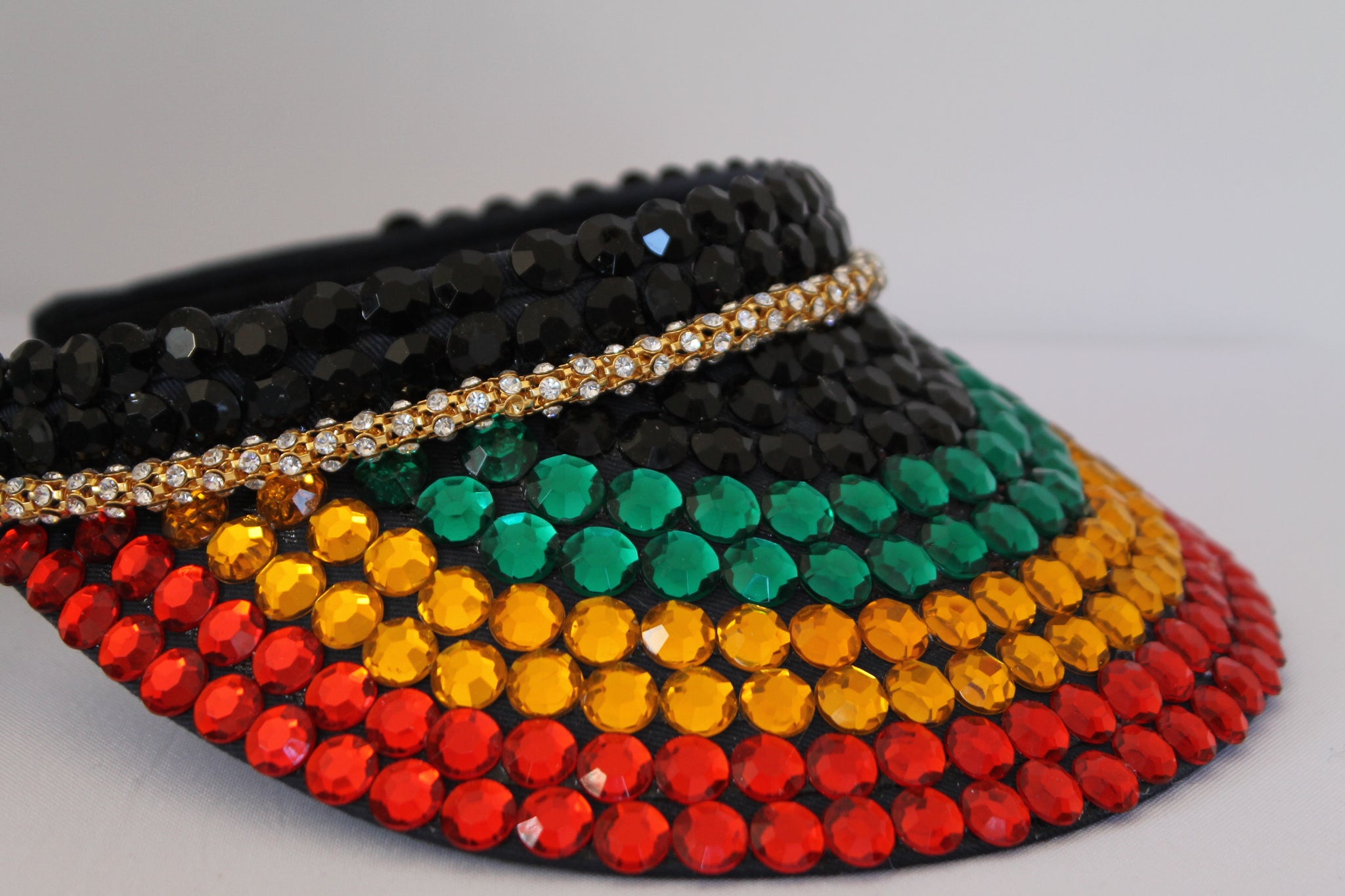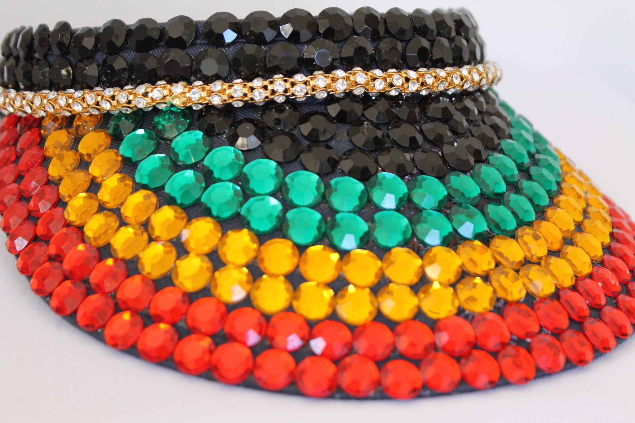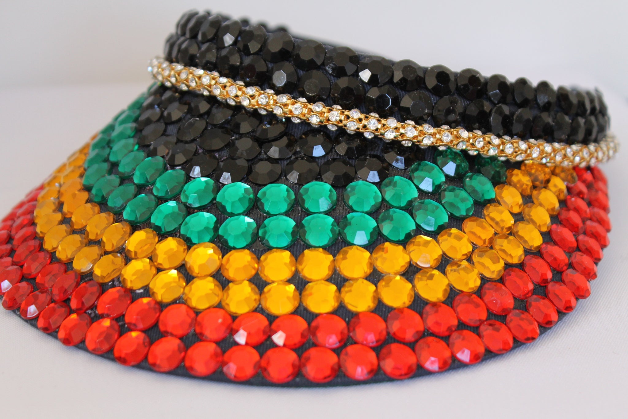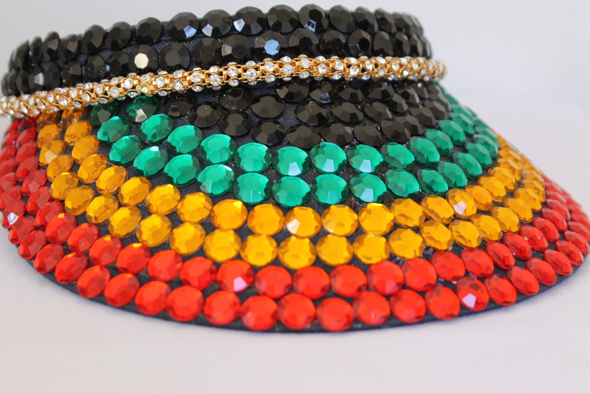 Be the "Princess In Town" with this beautiful visor. With a black base, this visor is covered in high quality red, green, yellow, and black gemstones. On the top, is a gold detail covered in mini clear stones. (With an open back, this visor can adjust to fit any adult sized head.)