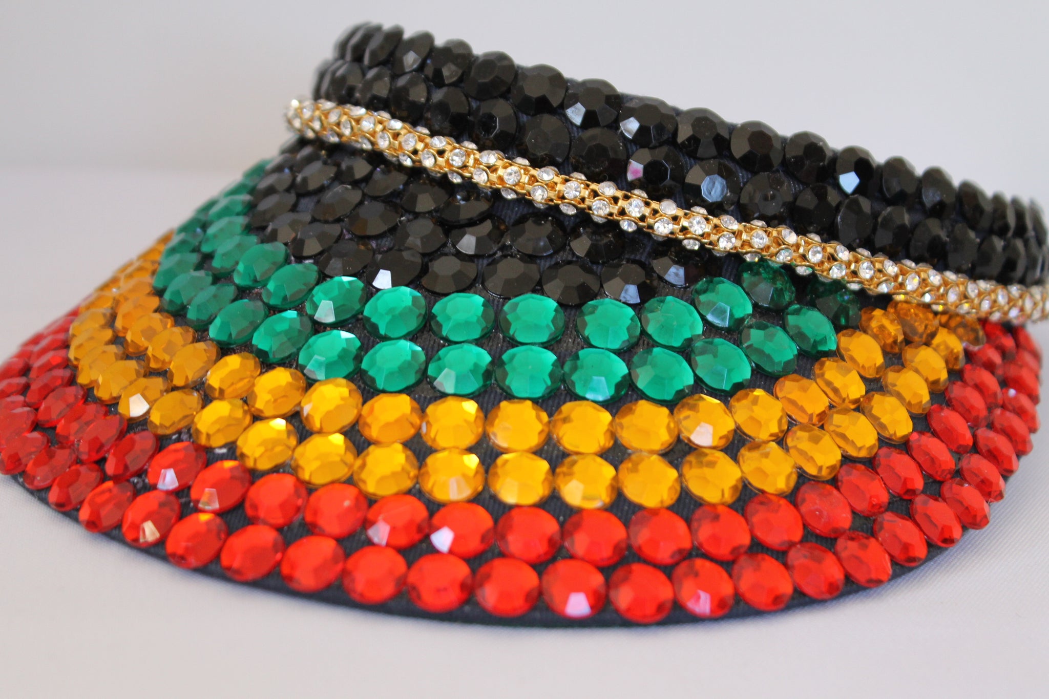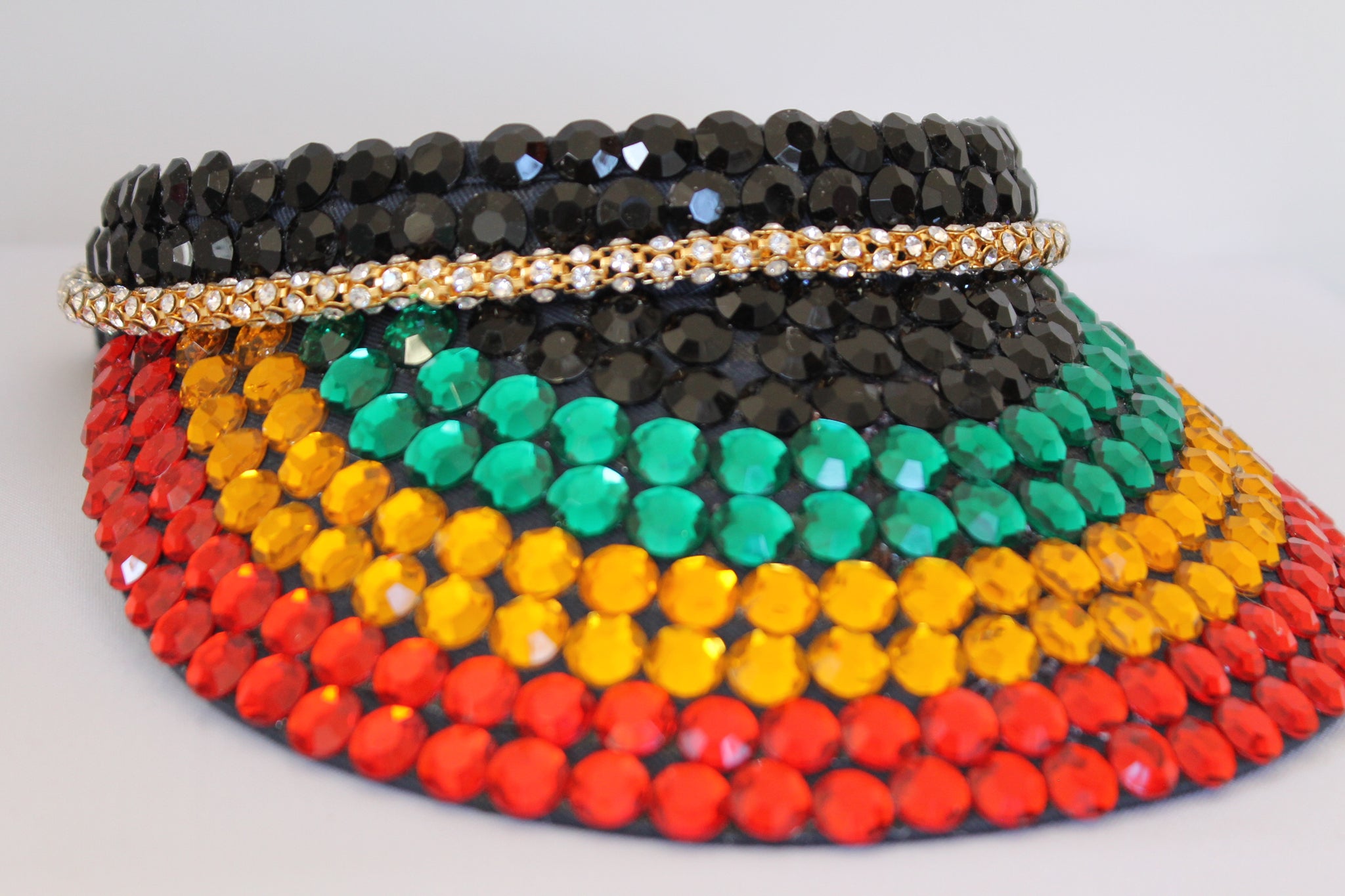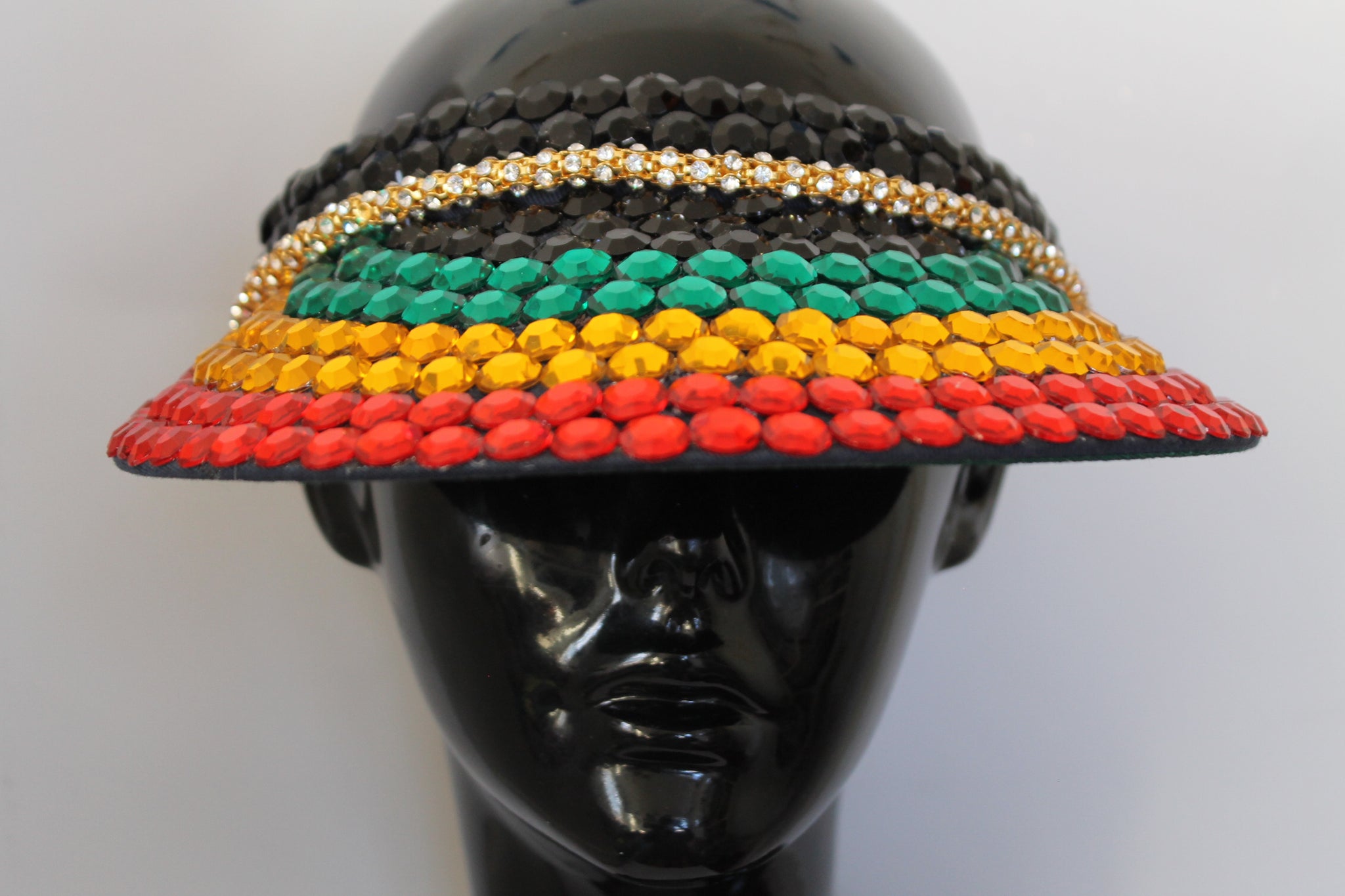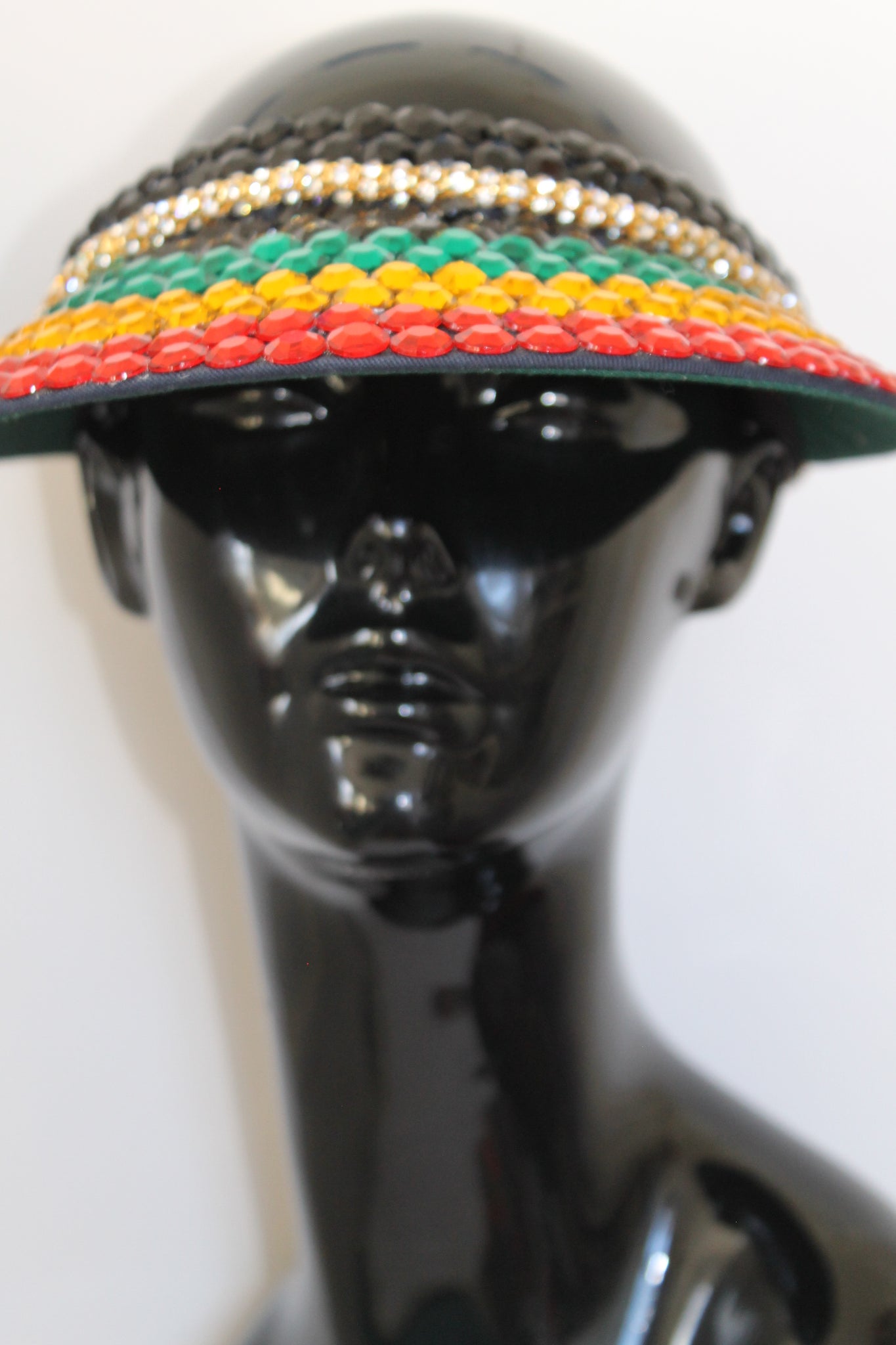 Be the "Princess In Town" with this beautiful visor. With a black base, this visor is covered in high quality red, green, yellow, and black gemstones. On the top, is a gold detail covered in mini clear stones. (With an open back, this visor can adjust to fit any adult sized head.)