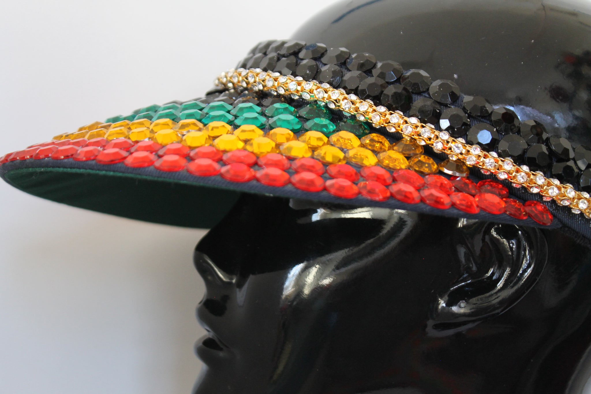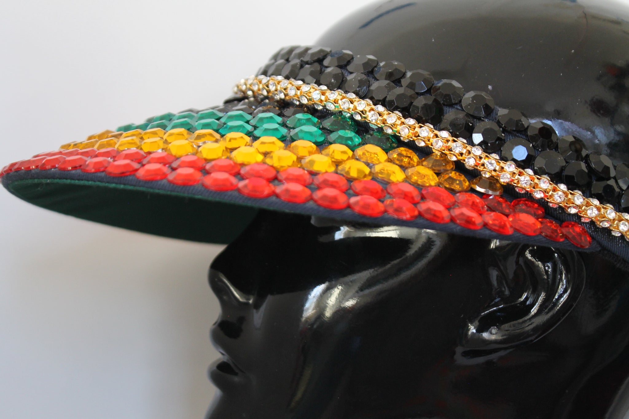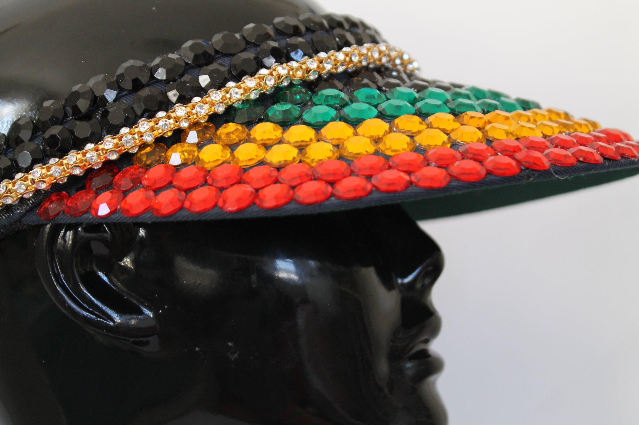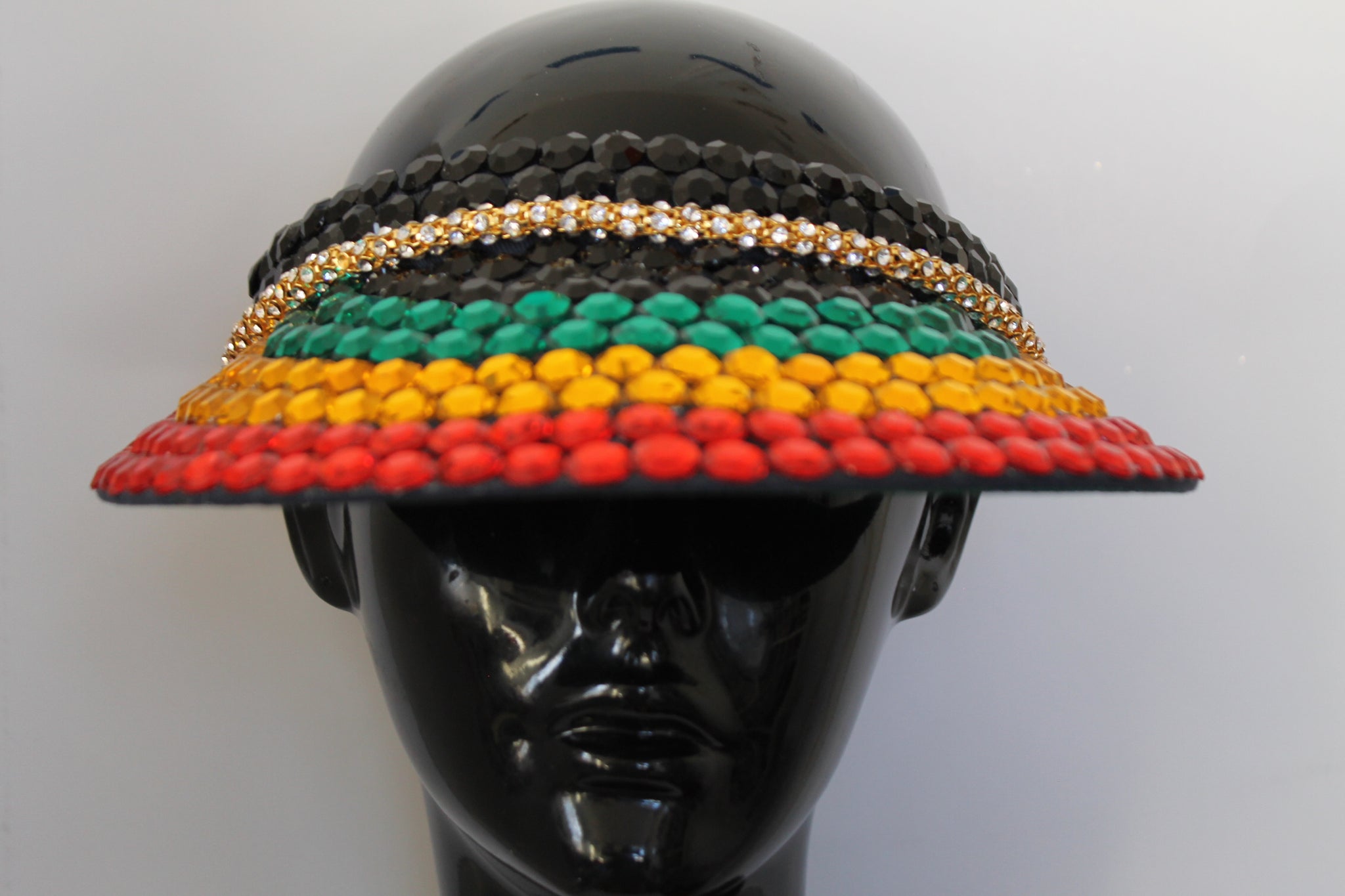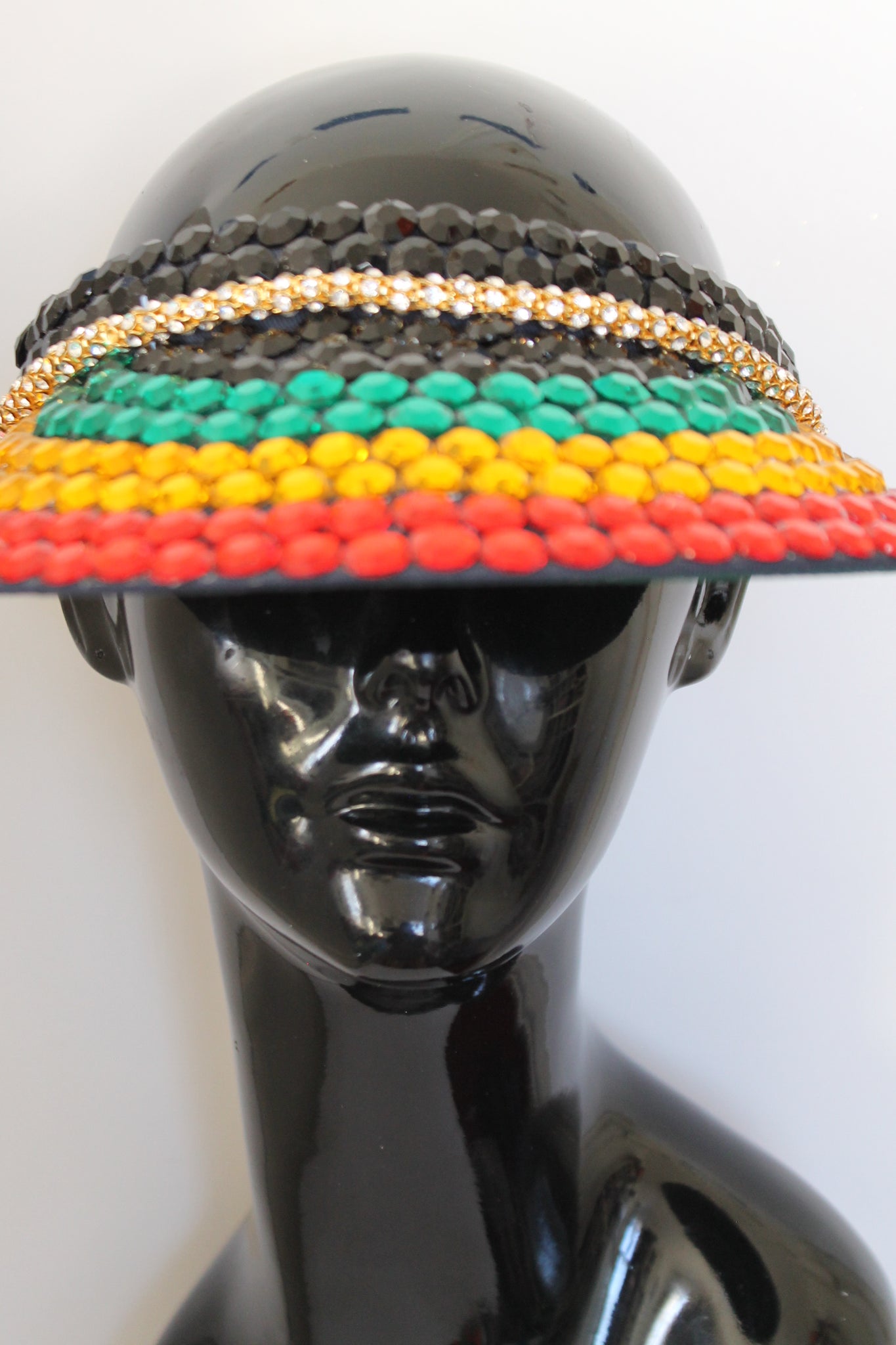 Be the "Princess In Town" with this beautiful visor. With a black base, this visor is covered in high quality red, green, yellow, and black gemstones. On the top, is a gold detail covered in mini clear stones. (With an open back, this visor can adjust to fit any adult sized head.)