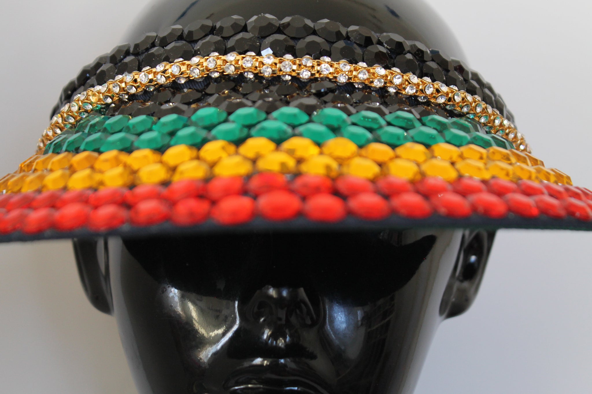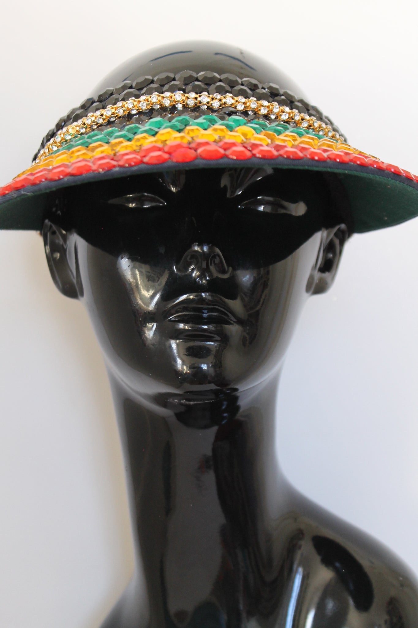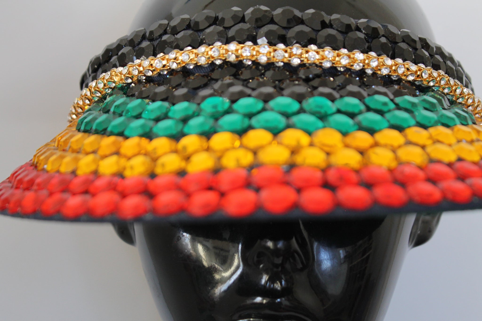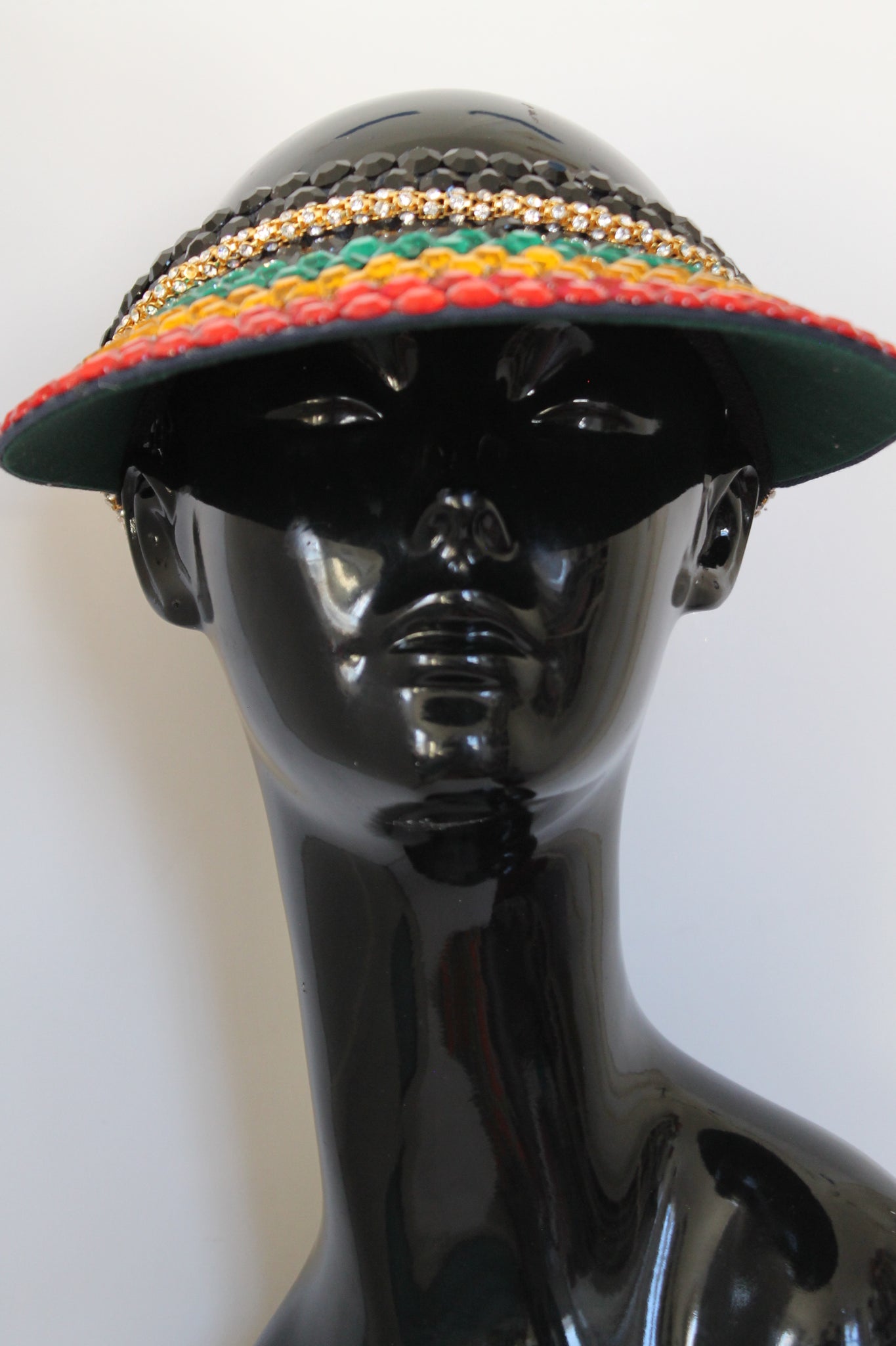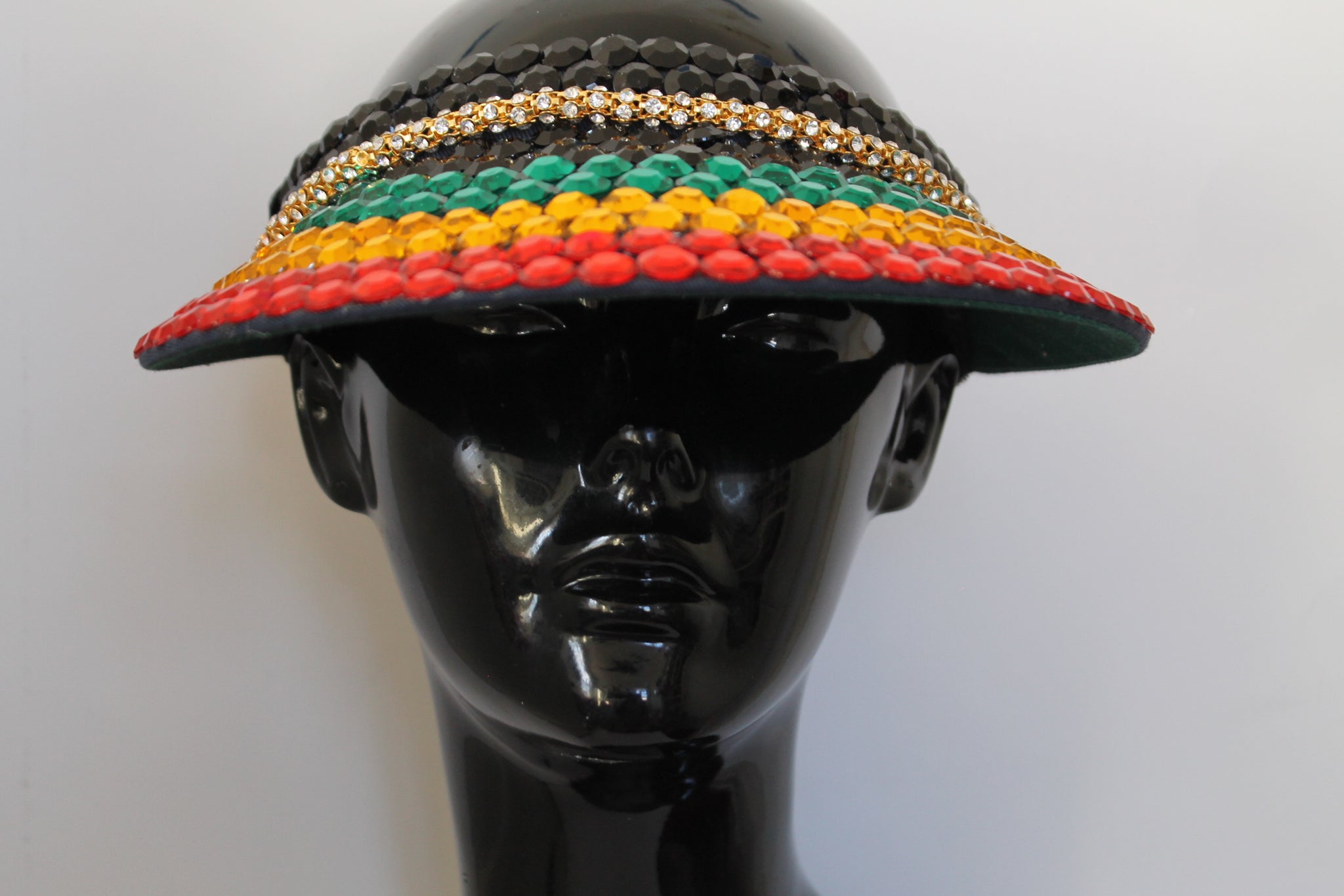 Be the "Princess In Town" with this beautiful visor. With a black base, this visor is covered in high quality red, green, yellow, and black gemstones. On the top, is a gold detail covered in mini clear stones. (With an open back, this visor can adjust to fit any adult sized head.)