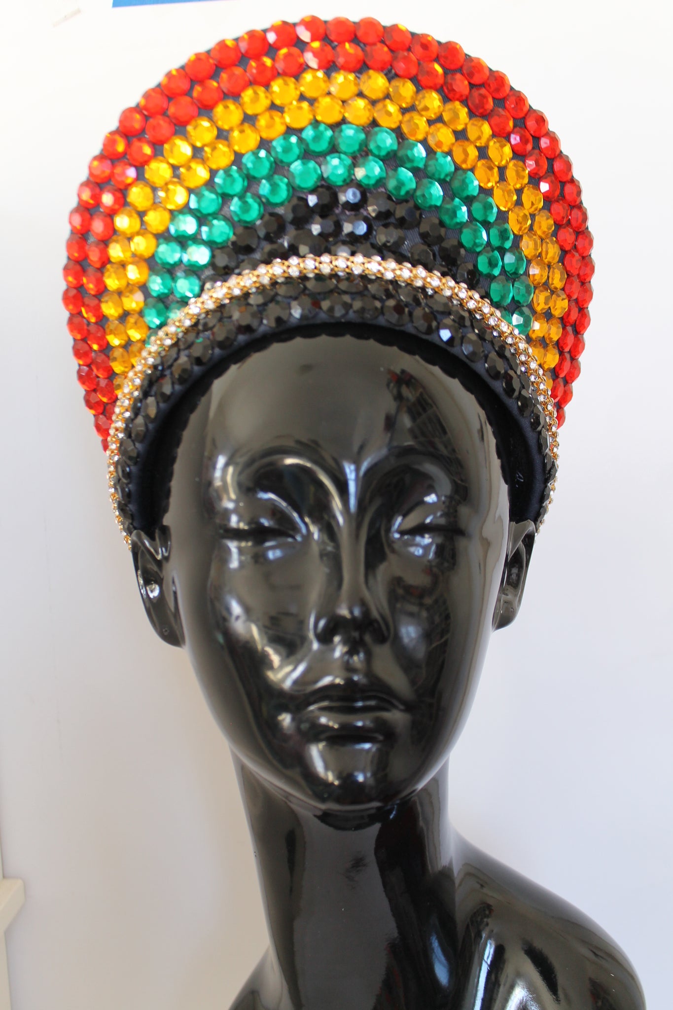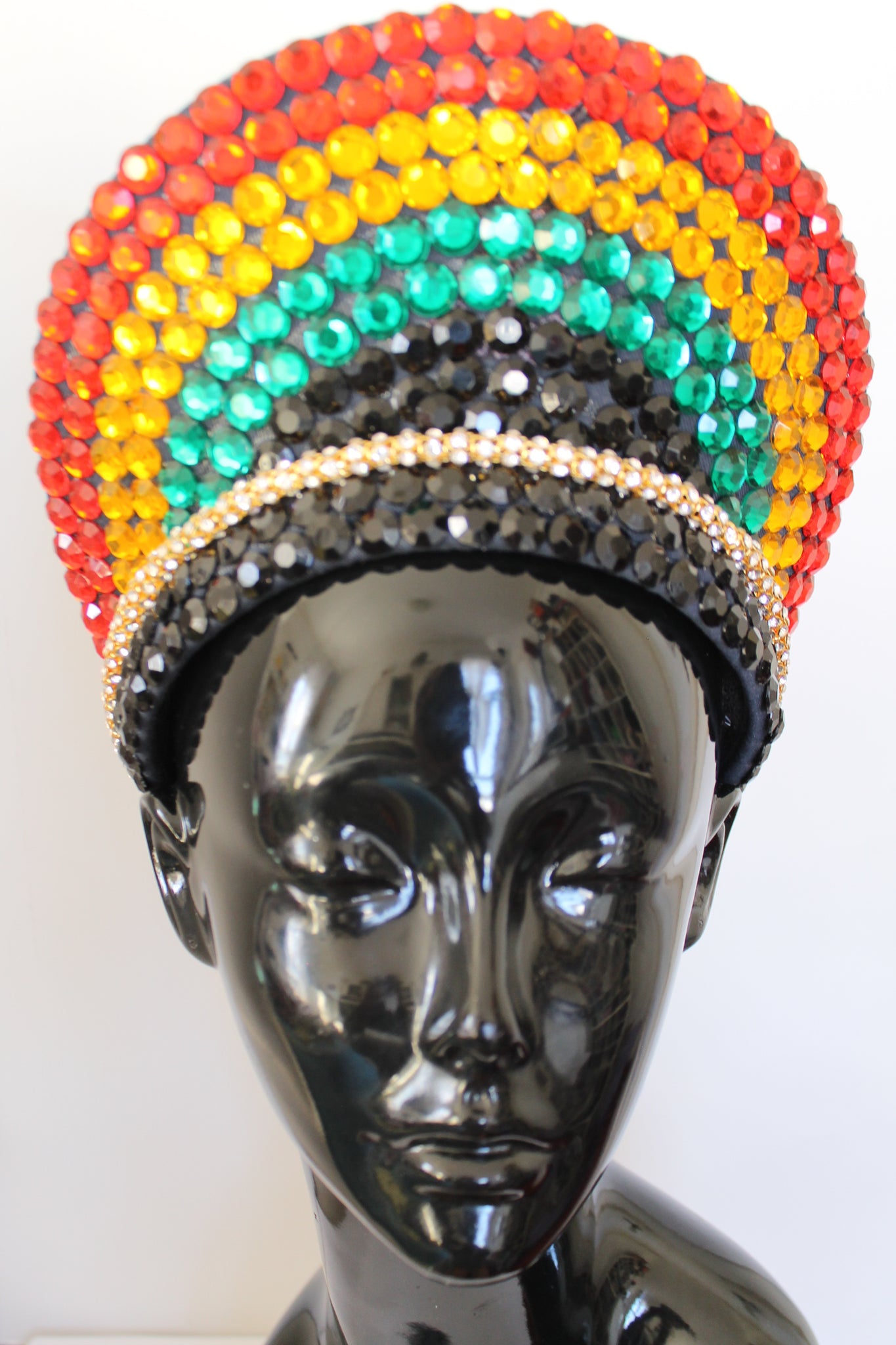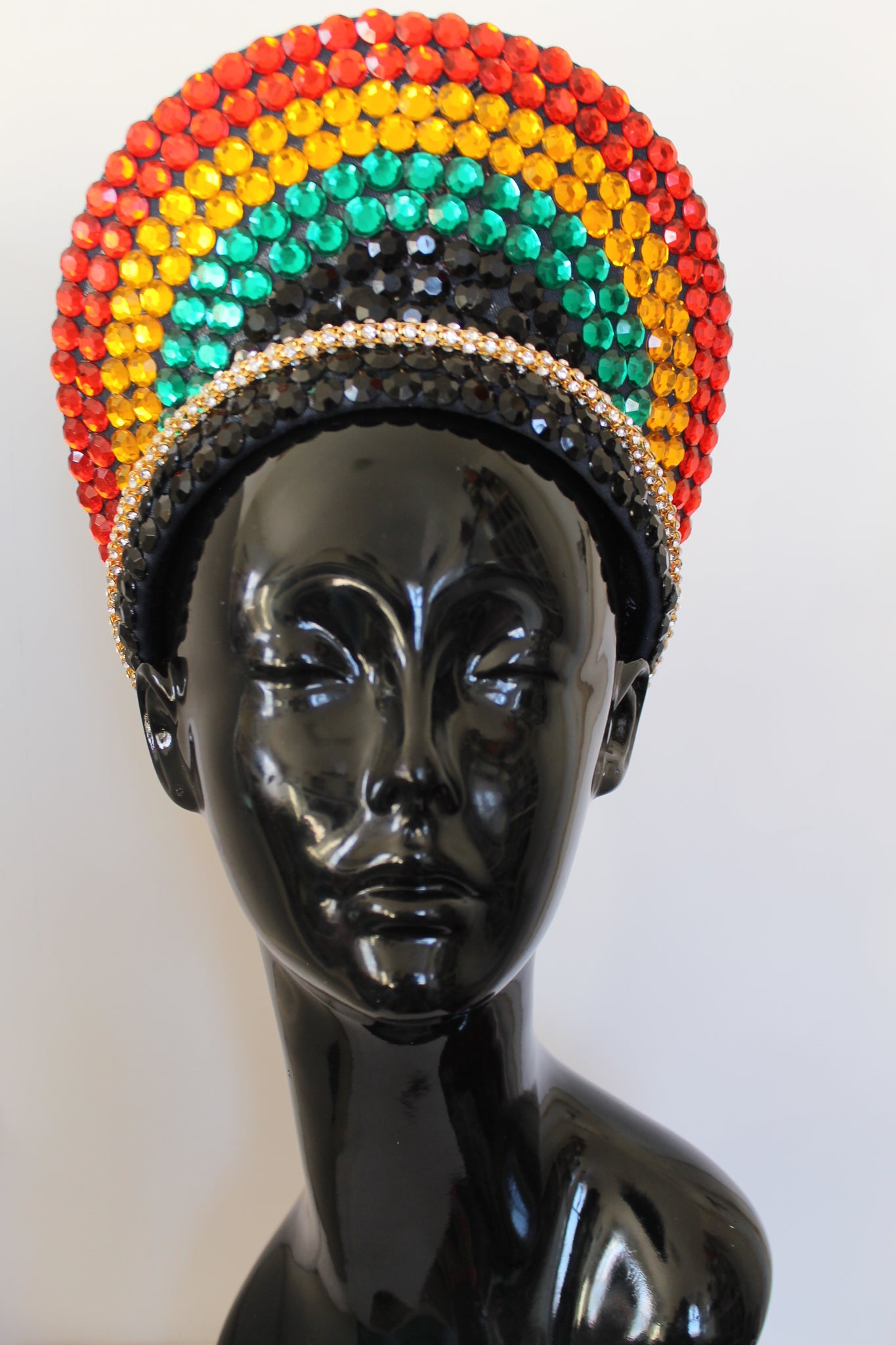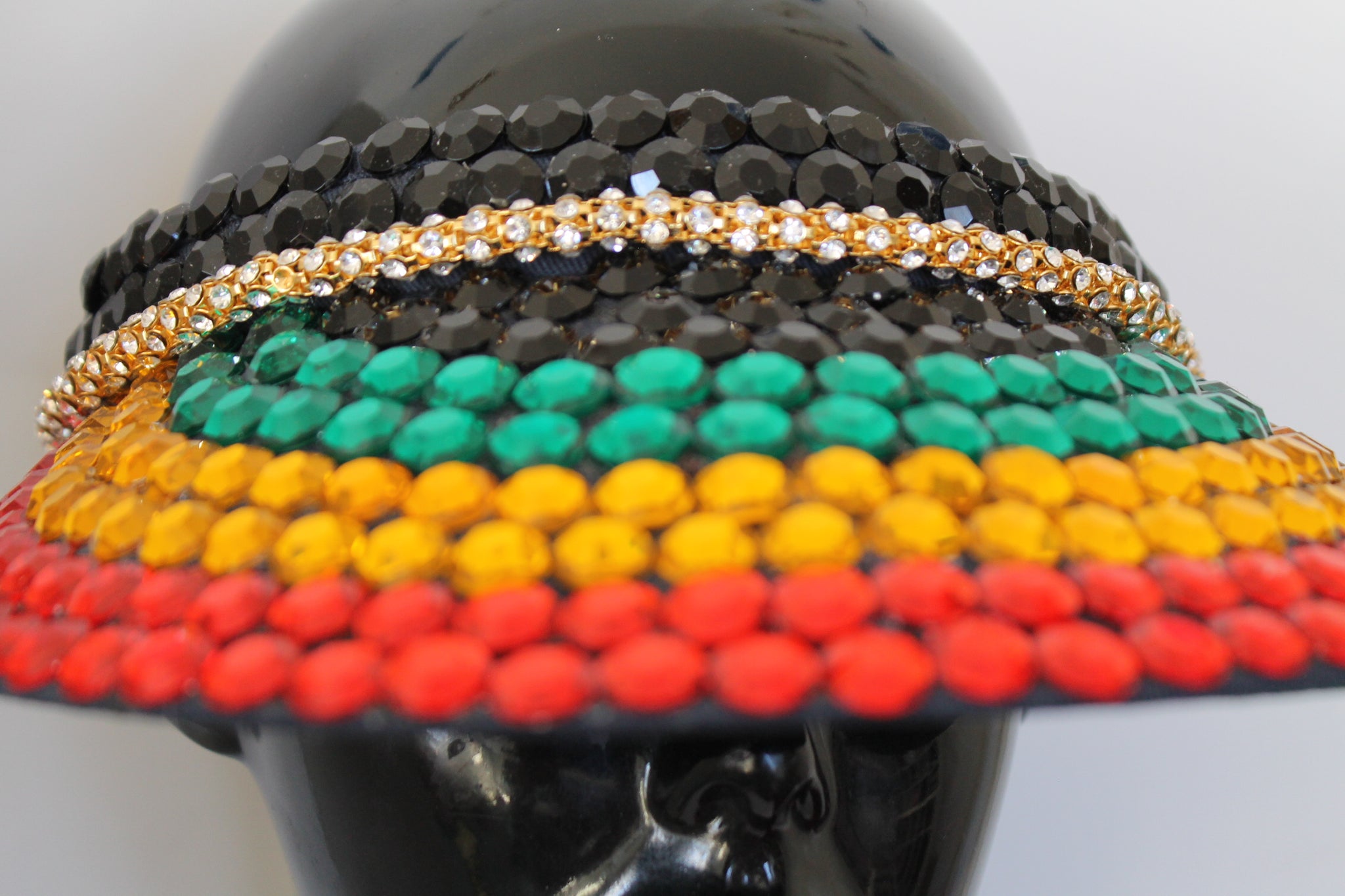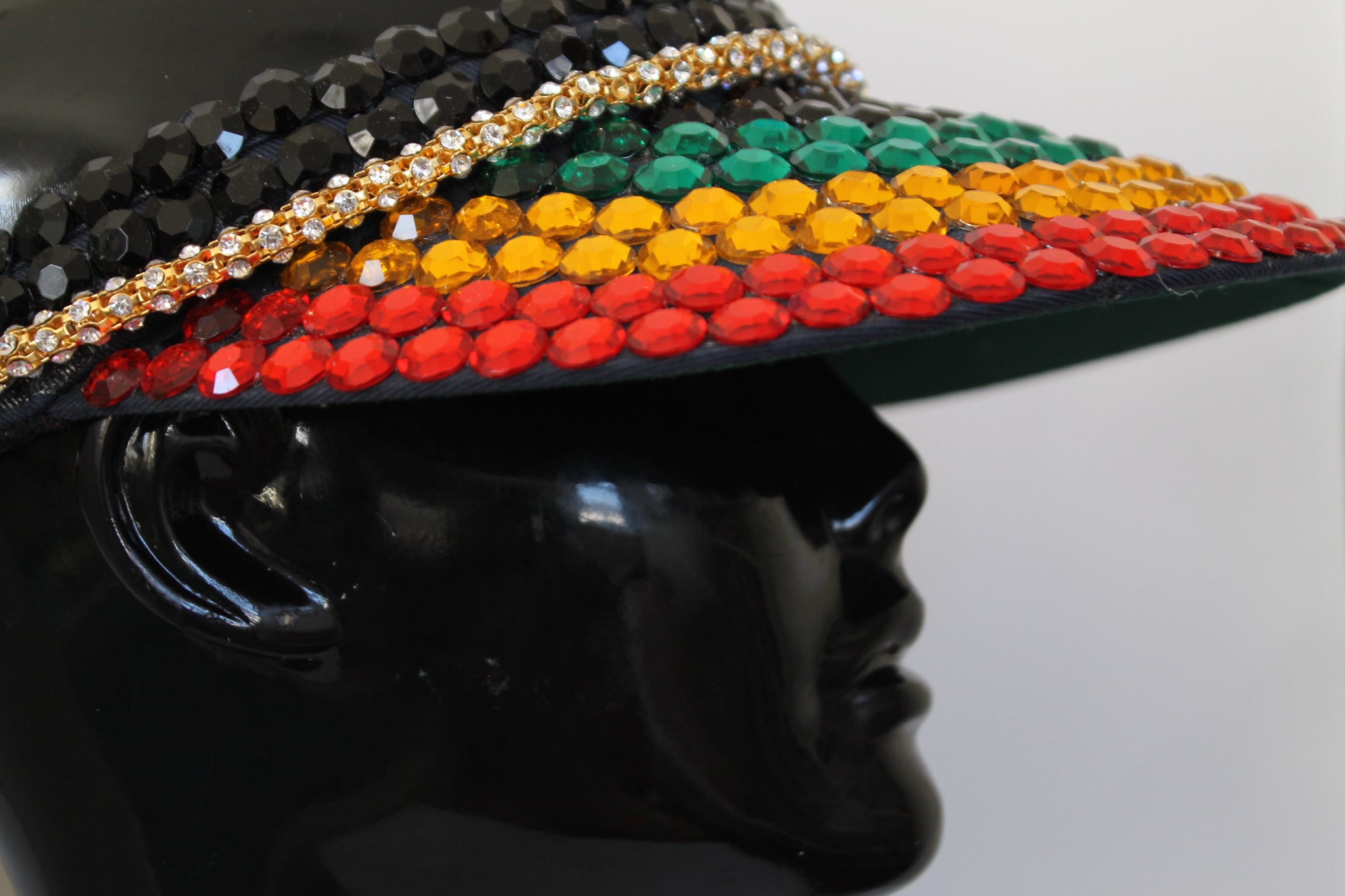 Be the "Princess In Town" with this beautiful visor. With a black base, this visor is covered in high quality red, green, yellow, and black gemstones. On the top, is a gold detail covered in mini clear stones. (With an open back, this visor can adjust to fit any adult sized head.)